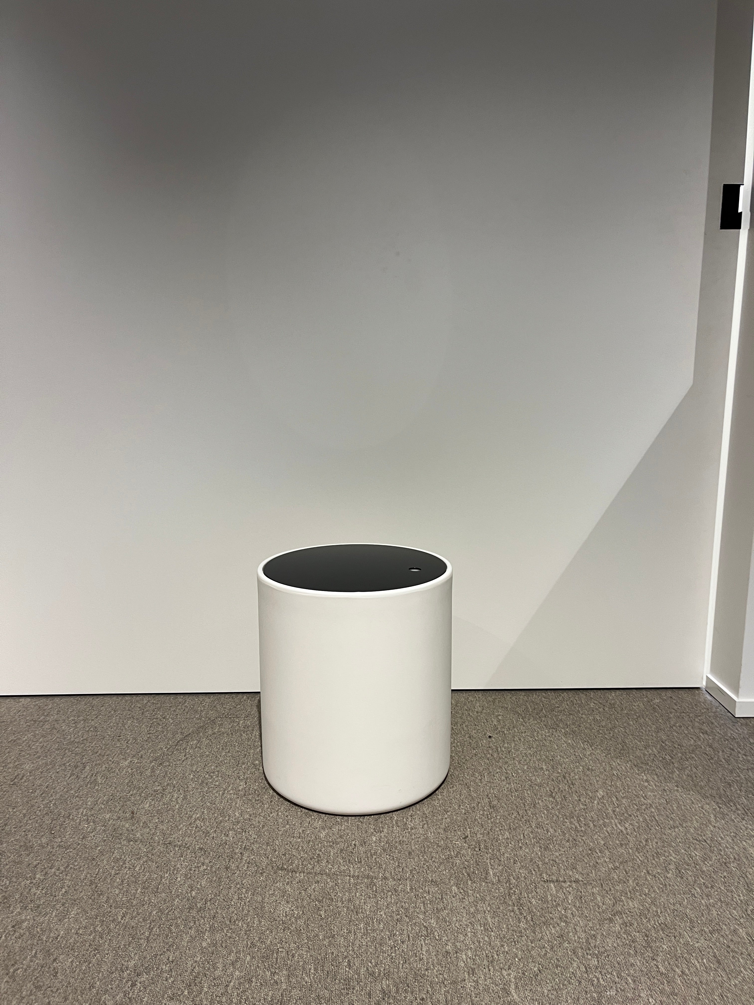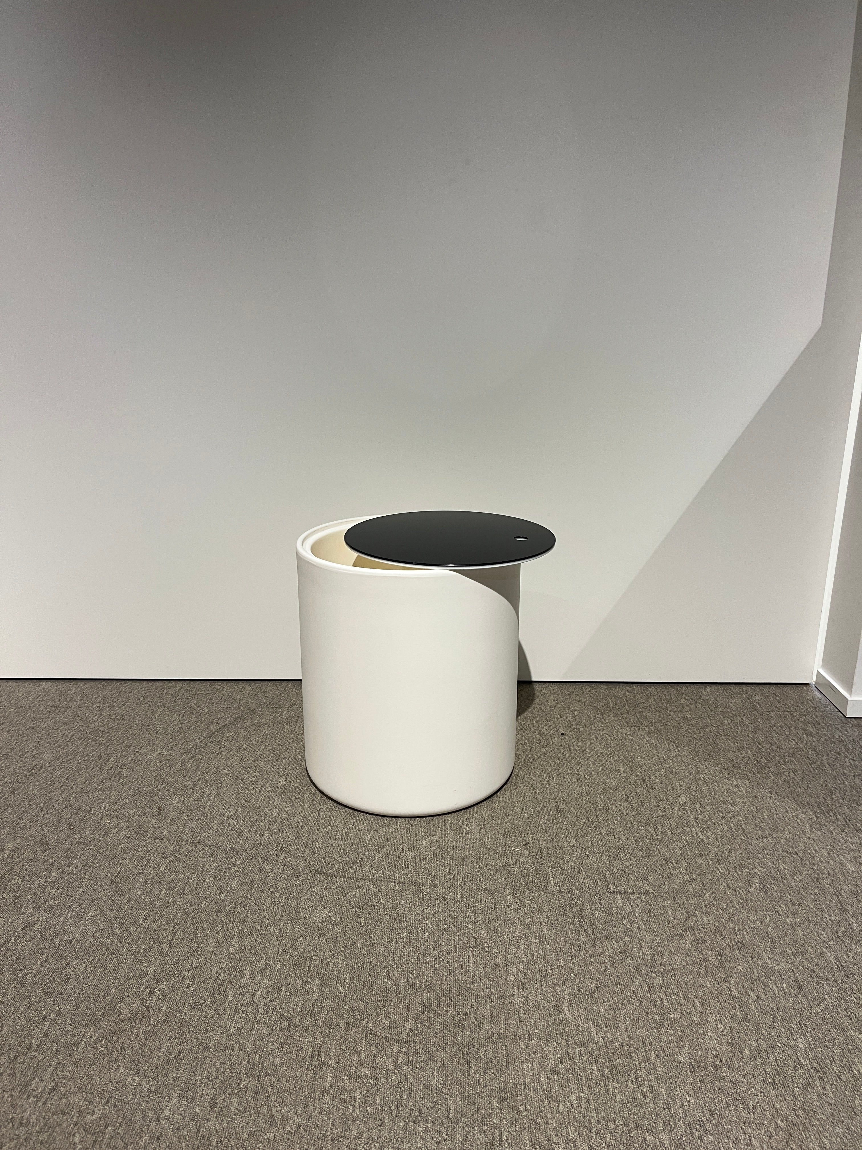 Deze bijzettafel kan perfect gebruikt worden als ijsemmer. Deze stijlvolle ijsemmer combineert een strak wit cilindervormig ontwerp met een contrasterend zwart deksel. Ideaal voor het koel bewaren en serveren van ijsblokjes tijdens feestjes of diners. Het tijdloze, minimalistische design maakt hem een elegante toevoeging aan elke bar of eettafel.