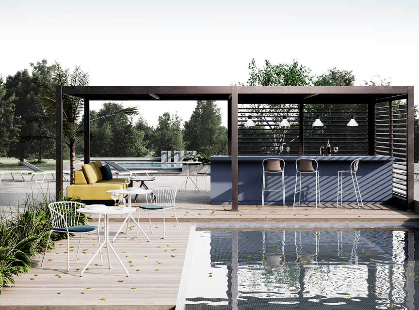 The Kasia stool subtly refines the idea of comfort and hospitality, even for sophisticated outdoor environments. The metal structure is treated to withstand the elements and combines with the technopolymer finish to enhance comfort and provide the possibility of adjustment for even the most demanding contract projects. Stackable for the daily needs of bars, restaurants and hotels, Kasia adds casual elegance to any commercial environment. Kasia Wrap stools, enriched with expert coverings and upholstery, create an attractive and adaptable appearance in countless combinations.
