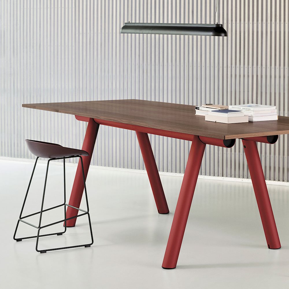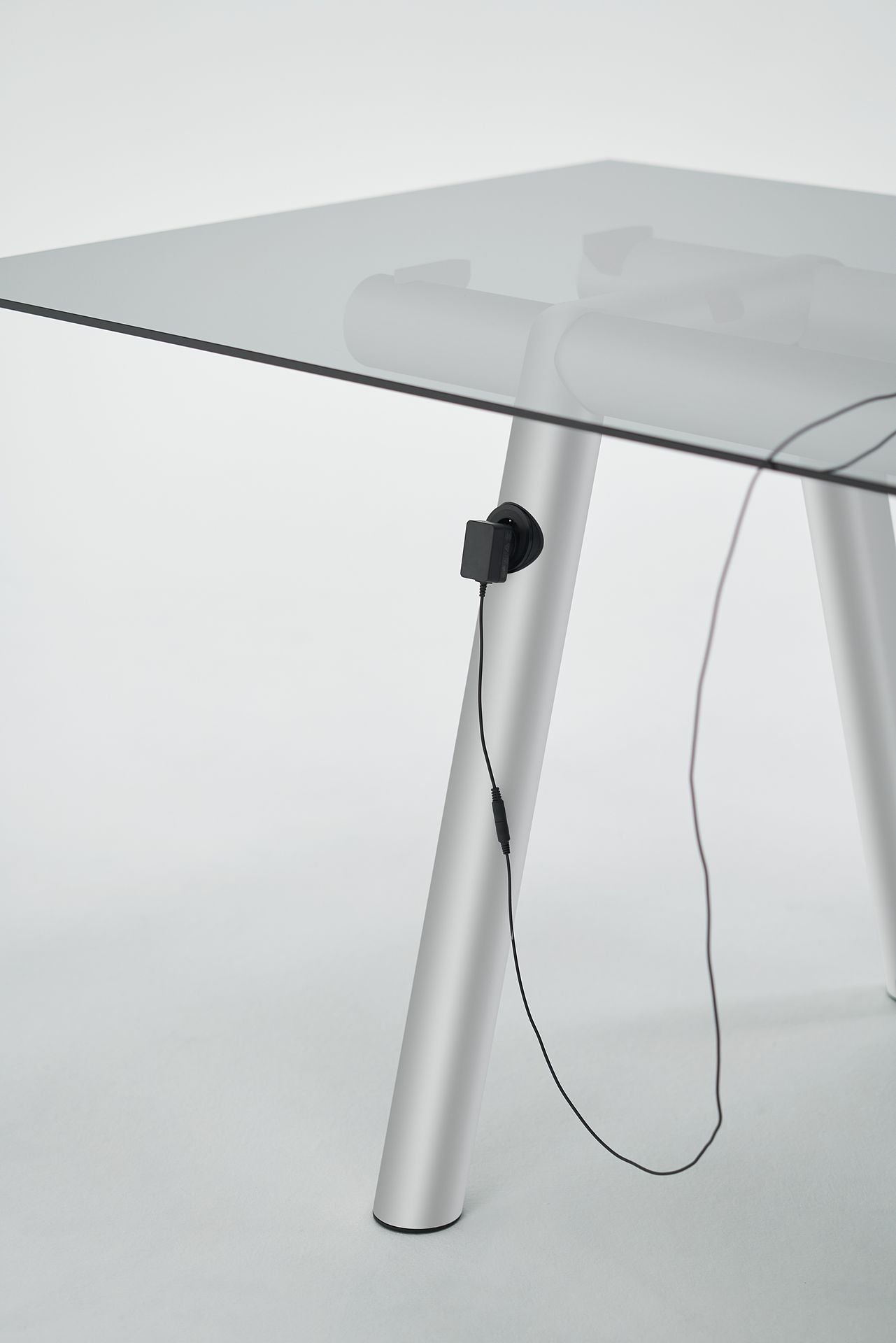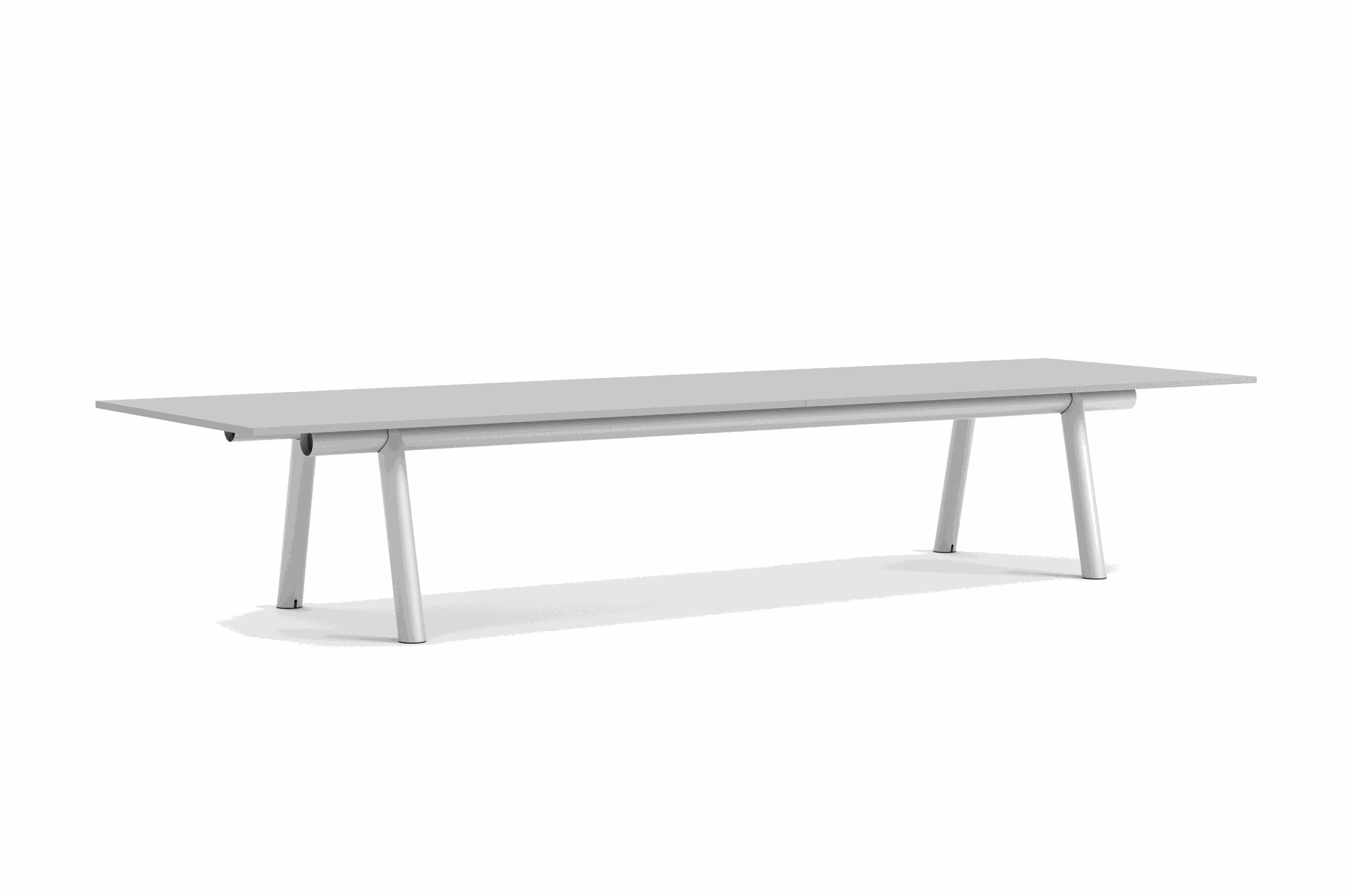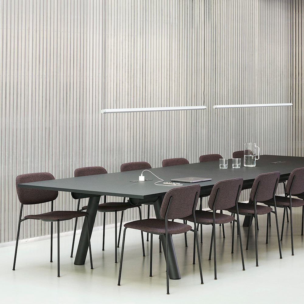 Discover the Boa Table by Stefan Diez, inspired by traditional Japanese bamboo craft. This contemporary take on the conference table combines craftsmanship with sustainability. The frame, made from 100% recycled Hydro CIRCAL aluminium, is produced in Denmark using renewable energy sources. Thanks to the use of flexible aluminum profiles, the Boa Table offers a lightweight and versatile solution, with a flat pack design for easy assembly. Suitable table tops are available in linoleum, laminate, wood or glass, while the frames are available in various colors and sizes. For additional functionality, power supply and cable storage accessories can be added, making the Boa Table suitable for a variety of professional environments.