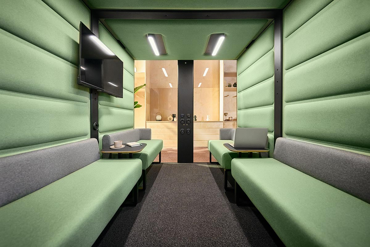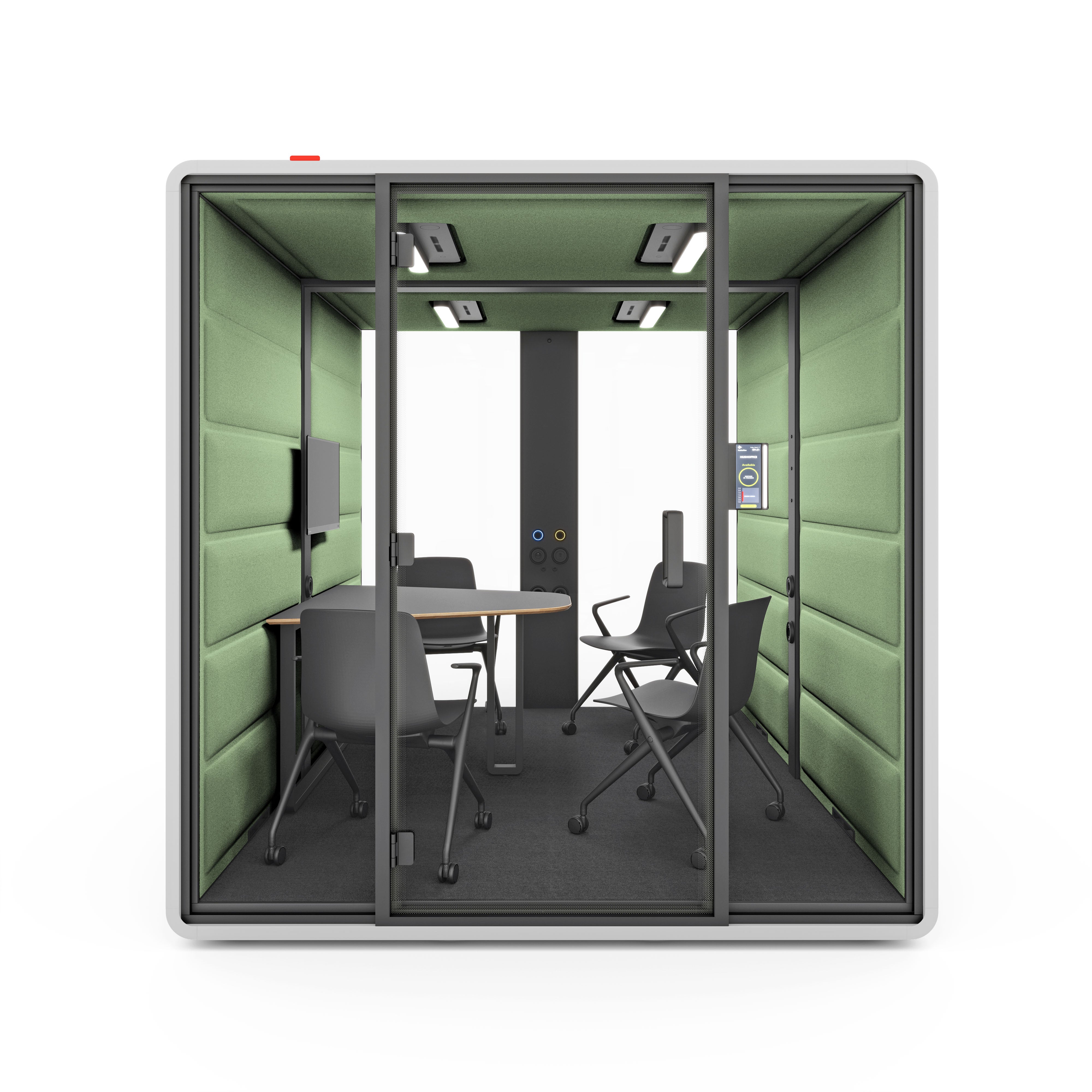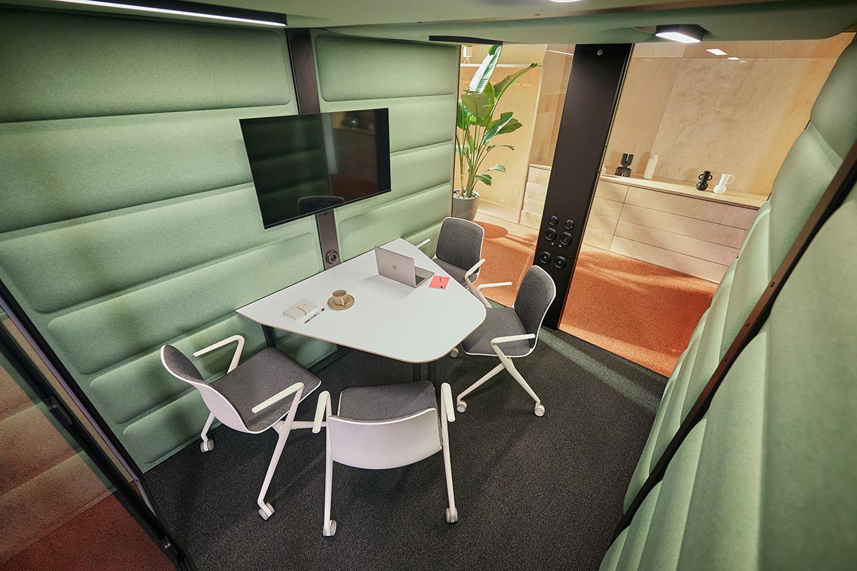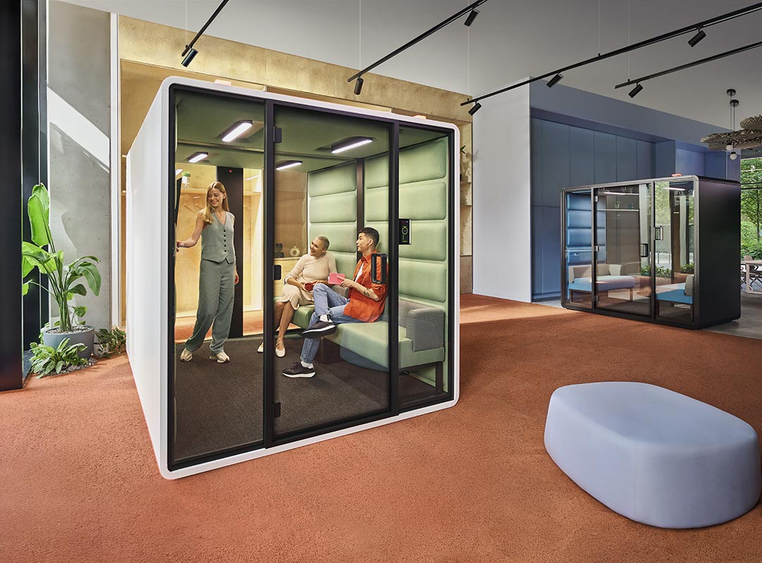 HushFree.L is a large acoustic booth and a smart alternative to traditional meeting rooms. It works perfectly for business meetings, presentations, video conferences with larger teams, or collaborative sessions – both on-site and online.