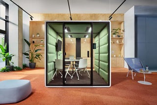 You can fully customise your HushFree.L, or choose a ready-to-use setup with two or four benches and one or two coffee tables. It comfortably accommodates 4 to 6 people depending on the configuration, offering a quiet space for meetings or focused work.