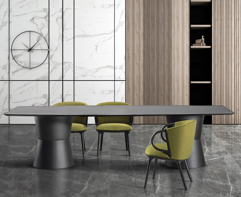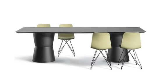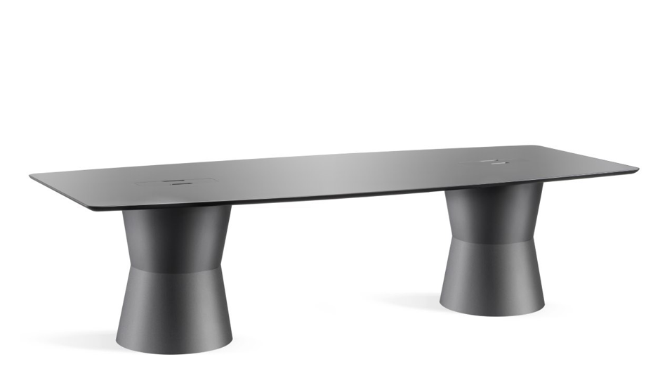 The versatile Nidaba collection offers round or oval table tops made of laminated or compact laminate, supported by a geometric and minimalist base made of 100% recyclable technopolymer. These striking Nidaba tables are true eye-catchers and will certainly not go unnoticed, thanks to their unique feature that allows them to change function when necessary. Upon request, the round table top can even be provided with a central hole with a container for plants, flowers, snacks, bottles, toys and more. By choosing Compactops, the Nidaba tables can also be used outdoors. The oval conference table can be supplied with two options for cable entry to the table top, made from the same material as the top, allowing comfortable use of electrical devices during meetings. The minimalist design of this collection ensures that it fits seamlessly into both working environments and catering establishments.