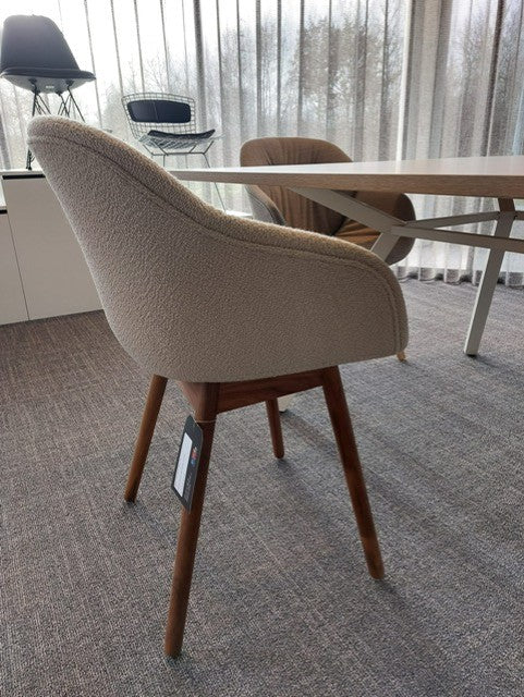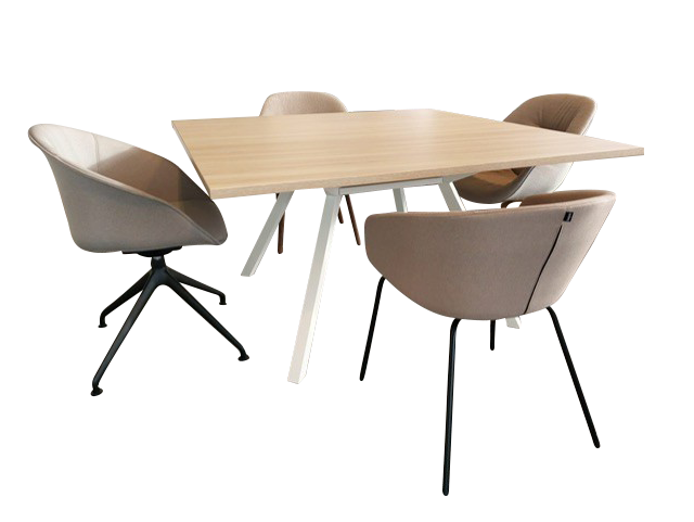 This outlet set consists of a modern square VPAX table combined with four comfortable chairs that together create a unique and original look. The VPAX table has a diameter of 140 cm, perfect for meetings, workplaces or cozy dinners. Around the table are four different chairs that complement each other and provide a playful and stylish setting.