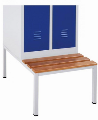 The WRC/2.1860 wardrobe with bench is a durable and functional solution for changing rooms. This metal locker is equipped with sturdy legs and an integrated bench for extra comfort. The bench has seat slats made of planed and lacquered beech hardwood on all sides, with rounded edges for comfortable seating.