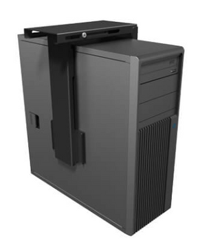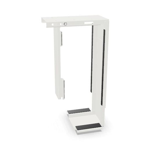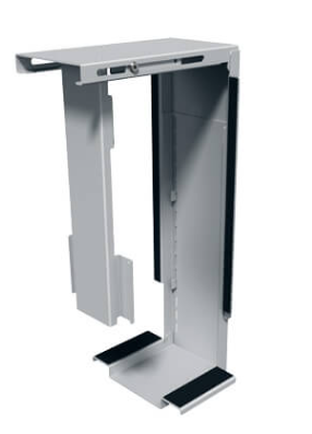 This fixed computer holder is mounted under a desktop and keeps a computer off the floor. This way the computer collects much less dust and is easier to access and maintain. The computer holder has self-adhesive tape on the surfaces that mount it to the tray. Simply 'stick and screw' to secure it to your desk.