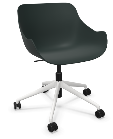 L'assise, de couleur vert foncé (RAL 6012), confère à la chaise un style moderne et distinctif, tandis que la structure blanche semi-mate (RAL 9010) apporte un contraste lumineux et élégant. Équipée de roulettes rigides pour sols souples , la chaise assure un déplacement fluide et silencieux sans abîmer les surfaces.