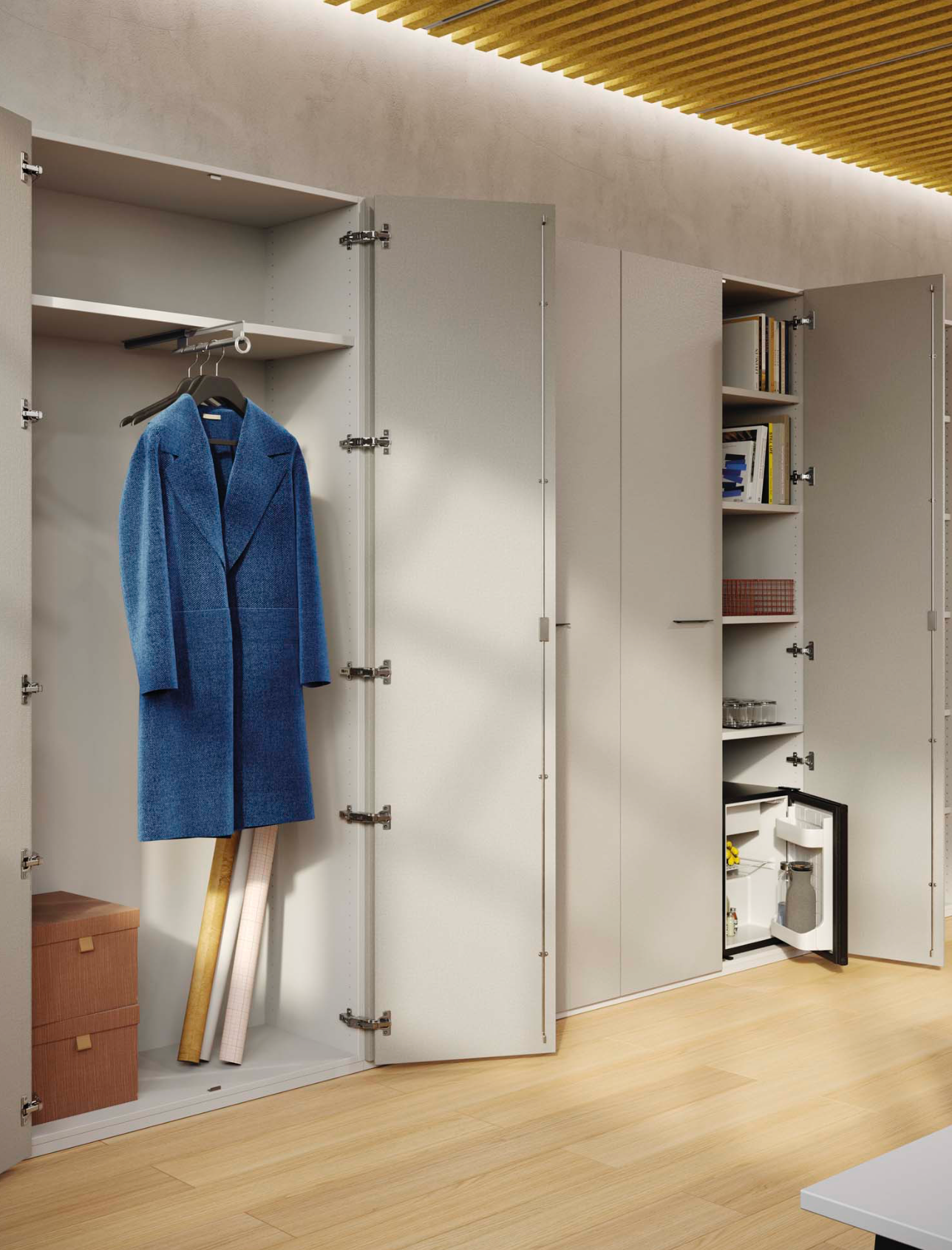 Options : charnières 165°, dispositif soft-closing, vaste choix de poignées, module réfrigérateur, porte-manteaux, jardinière et plus encore