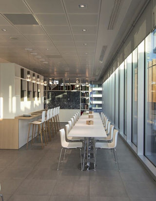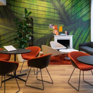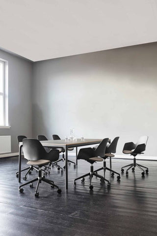 Ici, des versions principalement blanches ou noires du mobilier de bureau ont été choisies. Comme les longues tables de conférence noires de Fantoni (Quaranta 5) et les chaises blanches Catifa 46 d'Arper ou les chaises de conférence blanches Crossline de Sedus. Une table Eames ronde blanche de Vitra entourée de chaises Vitra HAL noires. Grâce à l'utilisation parfaite de meubles de haute qualité dans cet espace fantastique, une étude notariale élégante, raffinée, agréable et pratique a été créée.