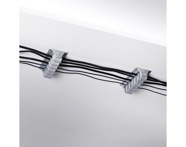 Les systèmes de gestion des câbles sont montés sous un plateau de bureau à l'aide de 4 vis autotaraudeuses (non incluses) et offrent de l'espace pour divers câbles. Les câbles sont simplement pressés entre les éléments de serrage, qui maintiennent les câbles soigneusement en place. Convient à presque tous les types de câbles.