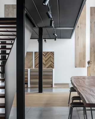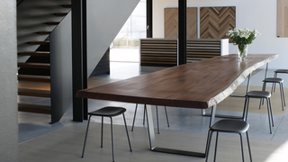Rond de opvallende lange houten vergadertafel staan acht handige Fiber Stools van MUUTO, ook ontworpen door designers Iskos-Berlin. De harmonieuze vormgeving van deze zwarte minimalistische krukjes zonder rugleuning is discreet. Ze hebben ook vier buisvormige poten.