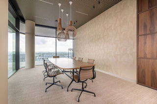 De grote Eames Segmented tafel in bootvorm van VITRA springt meteen in het oog. Deze tafel werd in 1964 ontworpen door Charles en Ray Eames. Het geëlectrificeerd tafelblad in Amerikaans notenfineer, bestaat uit twee delen. Het diepzwarte onderstel op stelvoetjes van deze klassieker is in persgietaluminium. Tien elegante camelkleurige lederen VITRA Eames EA104 draaibare aluminium stoelen met armleuning, staan opgesteld rond de tafel. Ze hebben een diepzwart stervormig onderstel, voorzien van glijders geschikt voor tapijt. Hun middelhoge rugleuning is ideaal voor rond een tafel.