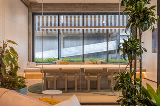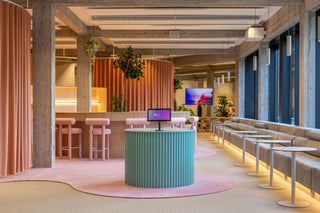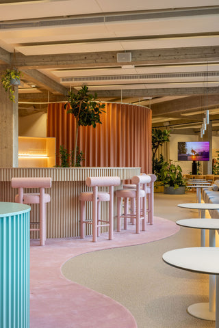 Op het gelijkvloers zijn de NOOM meubelen in zachte pastelkleuren en met houten poten, echte eyecatchers. De Flock collectie werd ontworpen door Kateryna Sokolova, ze wordt gekenmerkt door afgeronde silhouetten, sensuele en comfortabele vormen en zachte stoffen. ‘Flock’ verwijst naar ‘samenkomen’, ‘to flock’ in het Engels, de collectie wil een soort vredevolle, huiselijke, warme oase creëren in elke ruimte waar mensen samenkomen: ideaal dus voor de centrale hal van House of HR! De meubelen zorgen hier onmiddellijk voor een gevoel van intimiteit. Er is een mooie afwisseling te zien tussen de Flock Lounge Chair, de Flock Ottoman en de Freyja Coffee Tables in verschillende hoogtes. Verder werd ook de NOOM Low Chair in twee verschillende hoogtes gebruikt en de NOOM Bar Chair.