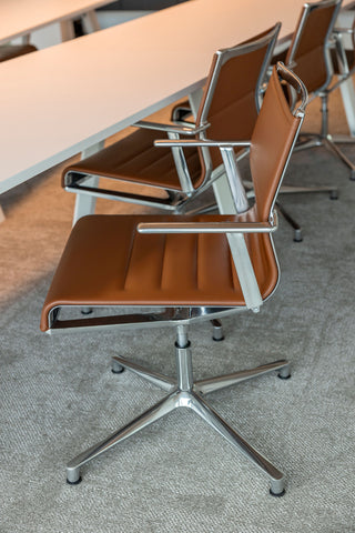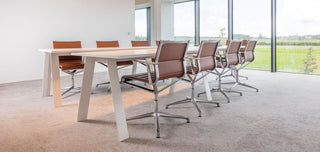 De opvallende witte op maat gemaakte U-vormige vergadertafel van FAMO, lijkt te wijzen naar het groene landschap buiten. Ze wordt omgeven door stijlvolle Italiaanse ICF Stick Chairs op wieltjes. Ze hebben lage ruggen en armsteunen. Er werd gekozen voor een warme bruine lederen bekleding.