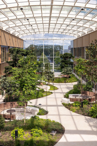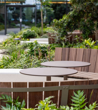 De statige biofiele atriumvormige inkomhal is voorzien van tal van groene planten en boompjes. Afgeronde zitruimtes zijn er verspreid over de ruimte tussen al het groen. De bruine elegante PEDRALI Elliot tafeltjes met stalen top en aluminium poot passen perfect bij het geheel. Er werd gekozen voor twee verschillende hoogtes.