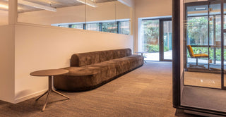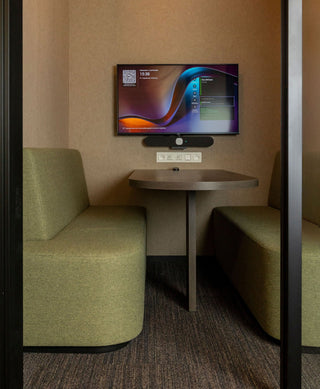 In kleine afzonderlijke vergaderruimtes werden op maat gemaakte comfortabele zitbanken geplaatst in een rustgevende olijfgroene stoffering. Ze zijn onderaan afgerond en het ruggedeelte is recht.