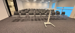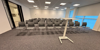 Laat je inspireren door de presentatieruimte op het tweede verdiep. Deze ruimte hebben we zacht aangepakt met de trend stoelen van LD Seating, wat zorgt voor een rustige uitstraling. Vooraan in de ruimte staat de MyBuddy presentatietafel, perfect voor een professionele setting.