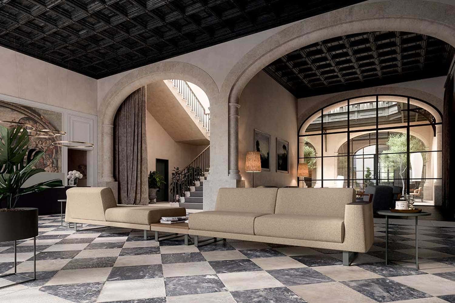 De metalen poten, originele bekleding, decoratieve stiksels en functionele accessoires maken Avana tot een bijna onmisbaar onderdeel voor collectieve ruimtes, zoals hotellobby's en -suites, wachtruimtes, huiselijke ruimtes maar ook gepersonaliseerde directiekantoren .