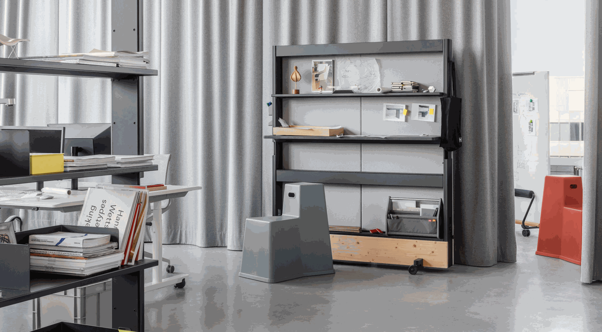 Dancing Wall bestaat uit een metalen frame dat in verschillende configuraties opgesteld kan worden: als boekenrek, tv-meubel, kapstok, plantenwand of als scheidingswand met verwijderbare magnetische whiteboards en prikborden. Het ontwerp laat ook toe om stroomkabels en functionele accessoires te integreren, zoals containers, haken en afdekkingen, die aangepast kunnen worden om te voldoen aan de behoeften van de onderneming.