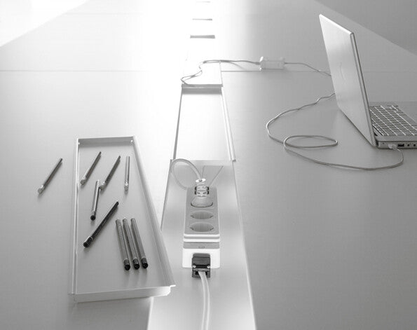 - De tafels zijn voorzien van een centrale box voor kabelmanagement: met deksel, waardoor de gehele oppervlakte gebruikt kan worden