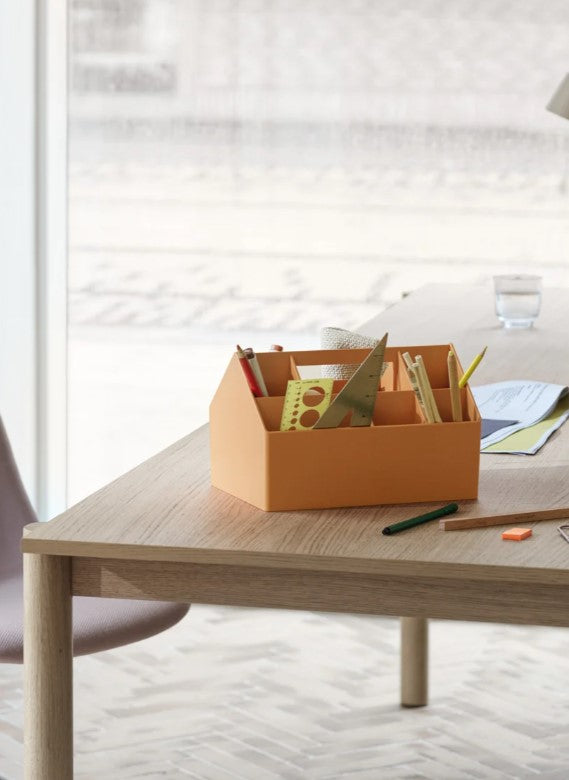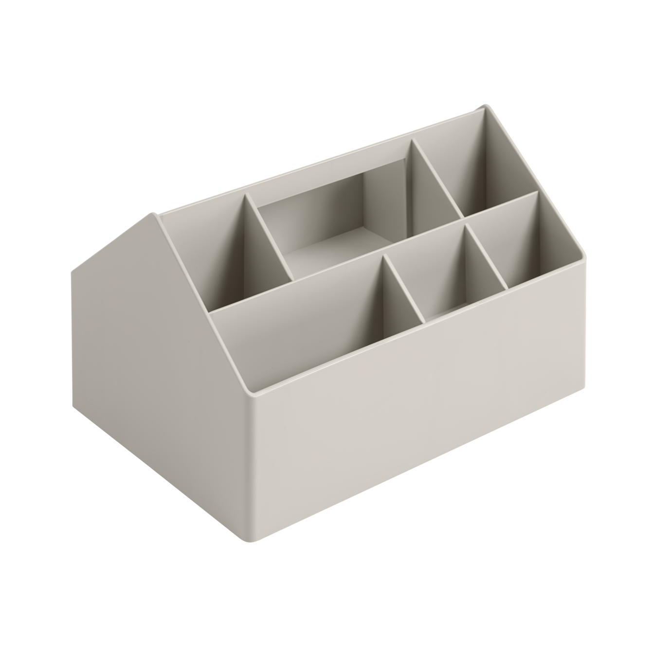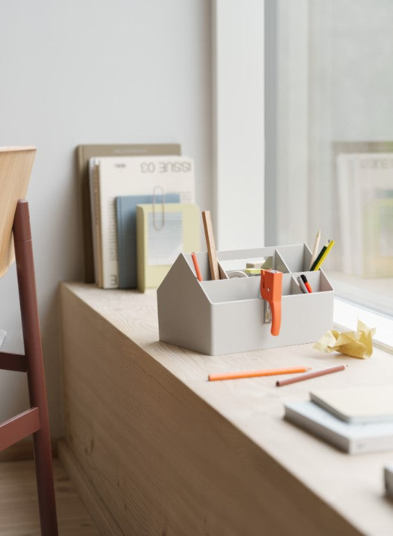 De Sketch Toolbox is een klein, vriendelijk stukje architectuur voor op het bureau, dat je helpt bij het organiseren van je gereedschap en objecten. Geïnspireerd door de eenvoudige architectuur van huizen, brengt het ontwerp functionaliteit en veelzijdigheid met zijn compartimenten van verschillende dieptes, samen met het handvat, waardoor het gemakkelijk te verplaatsen is. Gemaakt van 93% gerecycled plastic, is de Sketch Toolbox een vriendelijke metgezel voor het dagelijks leven, of het nu in het thuiskantoor is, op het werk, in de badkamer of waar je ook maar wat moderne opslag nodig hebt. Met een eenvoudig, functioneel ontwerp dat verwijst naar de eenvoudige architectonische lijnen van een huis, biedt de Sketch Toolbox verschillende ruimtes om een breed scala aan functies en behoeften in moderne persoonlijke opslag te accommoderen. Gegoten in één monolithisch stuk met een handvat voor draagbaarheid, is het een vriendelijke metgezel in het dagelijks leven - thuis, in de werkplaats of de nomadische werkplek. Deze veelzijdige gereedschapskist wordt vervaardigd in Denemarken met 100% gerecycled plastic.